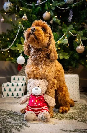 Introducing buddy Bear the perfect Christmas buddy for you pup. This cute Christmas bear is outfitted in delightful red and white striped knit pants and a patterned waist coat bringing a sprinkle of seasonal cheer.