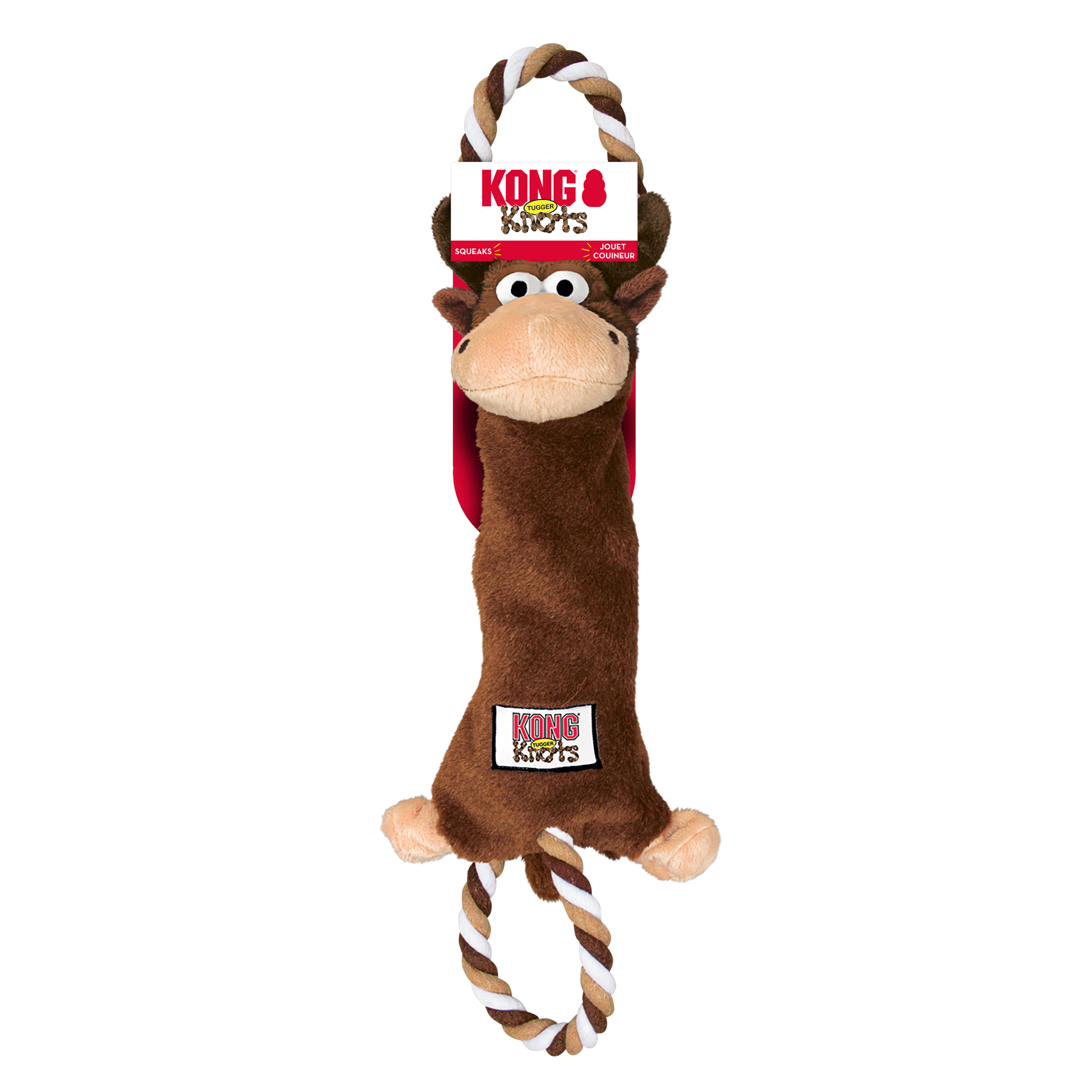 The KONG Tugger Knots Moose is a robust and engaging tug and shake toy that dogs absolutely adore. Each toy features knotted ropes inside, providing a realistic sensation, with tug handles extending from both ends. This innovative design offers an enticing mix of textures and resistance that dogs find irresistible, and it includes a squeaker for extra enjoyment.