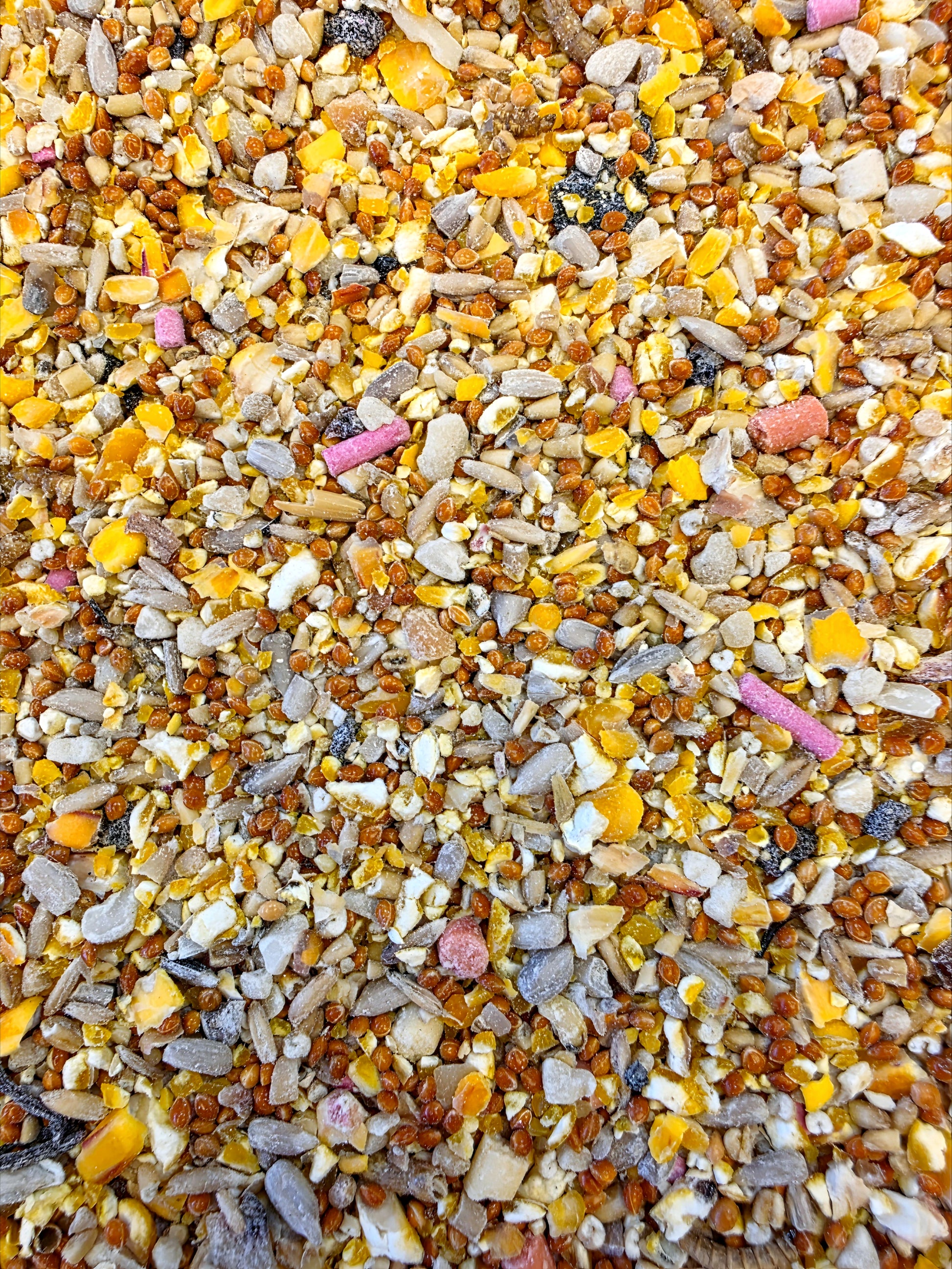 Kibbled Maize, Pinhead Oatmeal, Red Millet, Naked Oats, Kibbled Sunflower Hearts, Kibbled Peanuts, Sultanas, Suet Pellets, Berries and Mealworms.